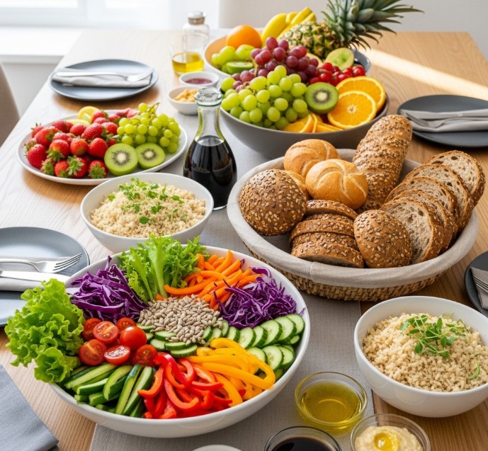 통곡물, 채소, 과일이 풍성한 식탁 이미지